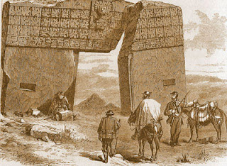forma retangular, esculpida num maciço de pedras que lembra uma porta. De